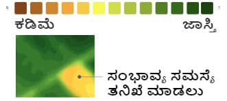 - ಕಲರ್ ಕೋಡಿಂಗ್ ನಿಮ್ಮ ಹೊಲಗಳಲ್ಲಿನ ಸಸ್ಯದ ಸಾಂದ್ರತೆಯನ್ನು ಮತ್ತು ಸಸ್ಯದ ತೇವಾಂಶ ವ್ಯತ್ಯಾಸವನ್ನುವ್ಯಕ್ತಪಡಿಸುತ್ತದೆ .ಇದು ನೀರಾವರಿ ಮತ್ತು ಸಸ್ಯದ ಆರೋಗ್ಯದ ಬಗ್ಗೆ ಸಂಭವನೀಯ ಸಮಸ್ಯೆಗಳನ್ನು ಉತ್ತಮವಾಗಿ ಗುರುತಿಸಲು ಸಹಾಯ ಮಾಡುತ್ತದೆ.